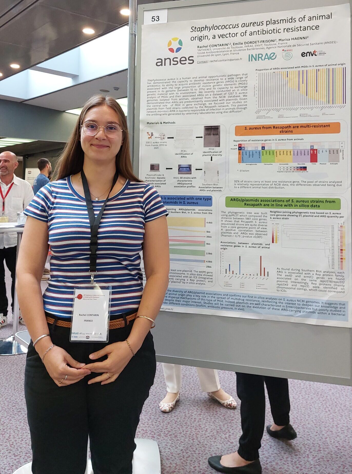 - La dissémination des gènes de résistances aux antibiotiques chez Staphylococcus aureus, avec la caractérisation de souches d’origine animale, issues du réseau Resapath, et de leurs plasmides (Collaboration avec l’Anses ; poster, Rachel Contarin).