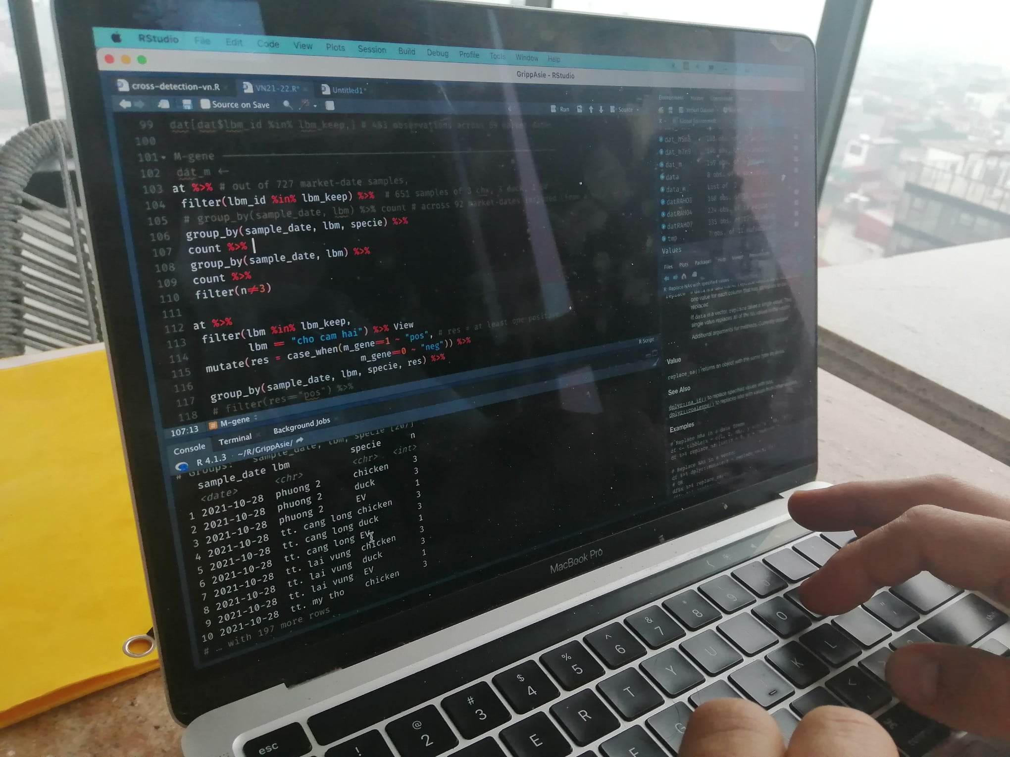 “Quel type d’échantillon est le plus pertinent pour détecter un virus d’influenza aviaire qui circule dans un marché de volailles vivantes ? Un écouvillon trachéal sur des canards ? Sur des poulets ? Un prélèvement de fientes ? Nous avons passé ces deux derniers jours dans notre laboratoire éphémère d’épidémiologie à Hanoï à manipuler la base de données des résultats de surveillance de grippe aviaire dans les marchés de volaille au Vietnam en 2021 et 2022. On y retrouve des virus de plusieurs sous-types sur des poulets, sur des canards et dans l’environnement des marchés. Par l’intermédiaire de modèles statistiques, ces données sont en train de parler et nous permettront demain, au cours d’une réunion finale de restitution, de proposer aux services vétérinaires vietnamiens des éléments permettant d’optimiser leur protocole de surveillance pour s’assurer d’une détection précoce de ces virus circulants.”
