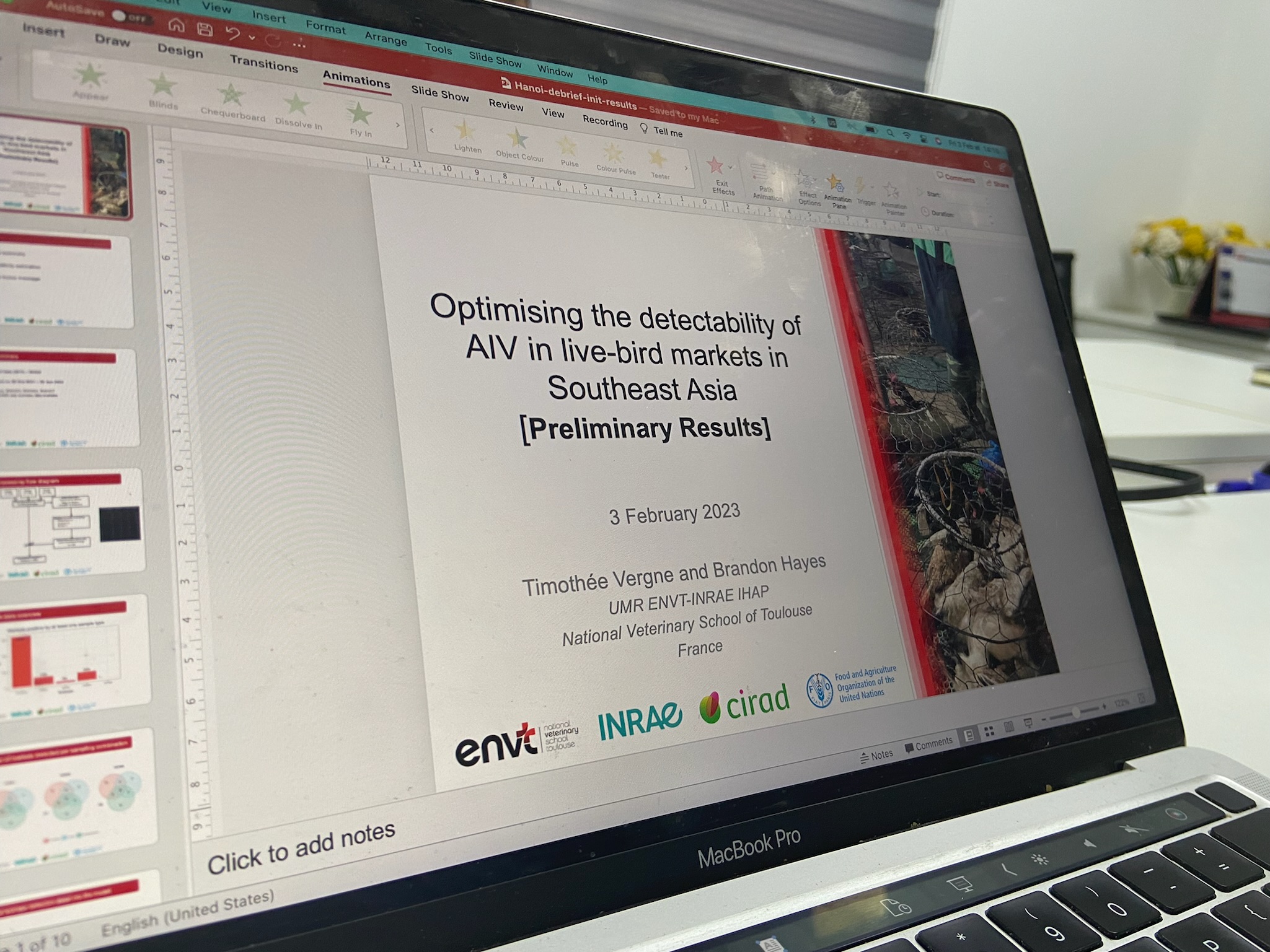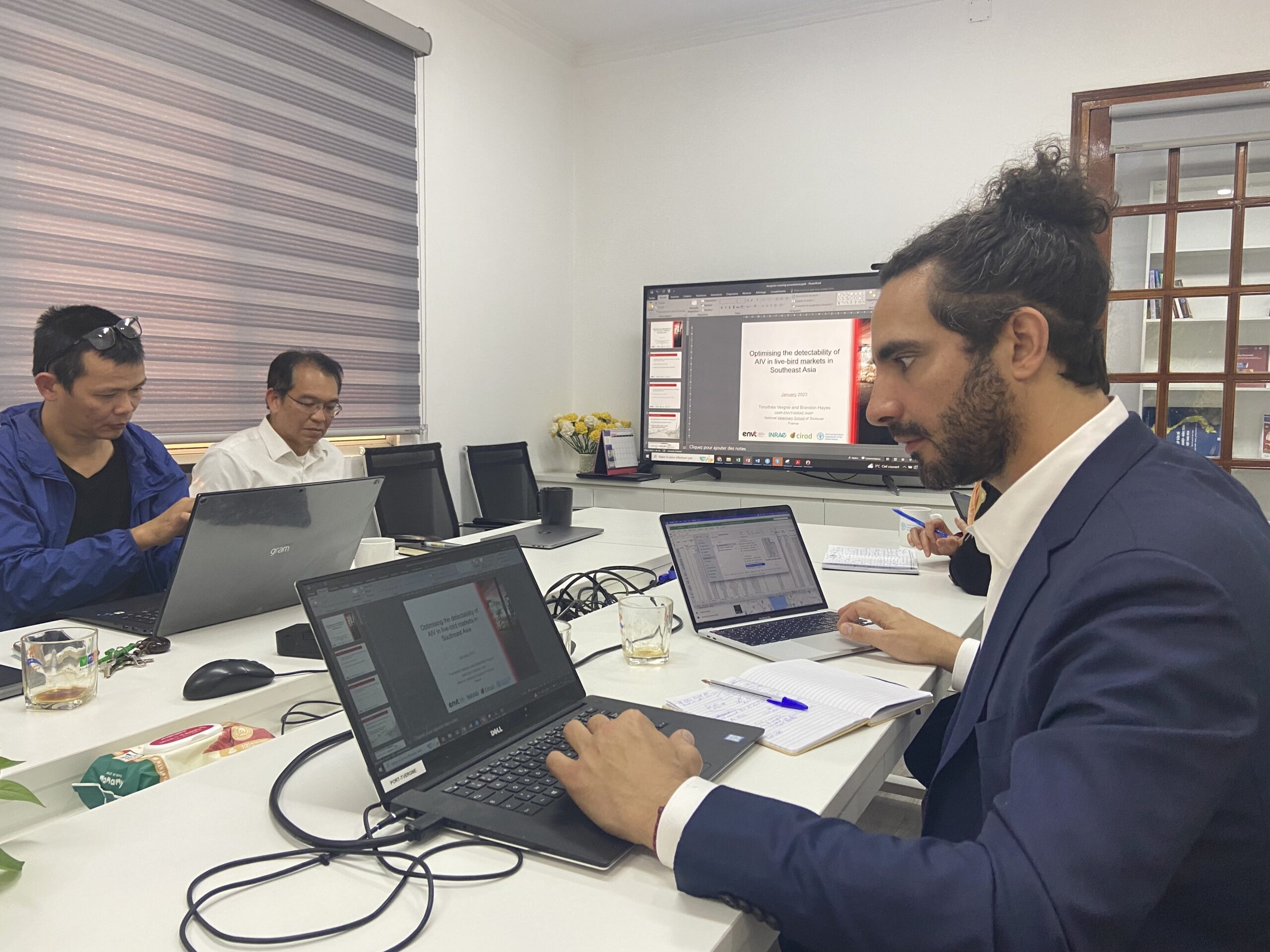 “Dernière ligne droite ! Nous faisons les derniers ajustements de notre modèle et mettons à jour la présentation des résultats, puis nous dirigeons vers les bureaux de la FAO-ECTAD Vietnam pour discuter avec les services vétérinaires vietnamiens des résultats préliminaires que nous avons obtenus sur l’efficacité des protocoles de détection des virus de grippe aviaire dans les marchés de volailles vivantes au Vietnam en 2021-2022. Les conclusions sont éloquentes : pour détecter la grippe aviaire (H5N1 et H5N8) dans les marchés de volailles, échantillonner les canards a été bien plus efficace que prélever l’environnement, ce qui, à son tour a été beaucoup plus efficace que de prélever les poulets. Résultats très bien accueillis. De nouvelles idées surgissent des discussions !“